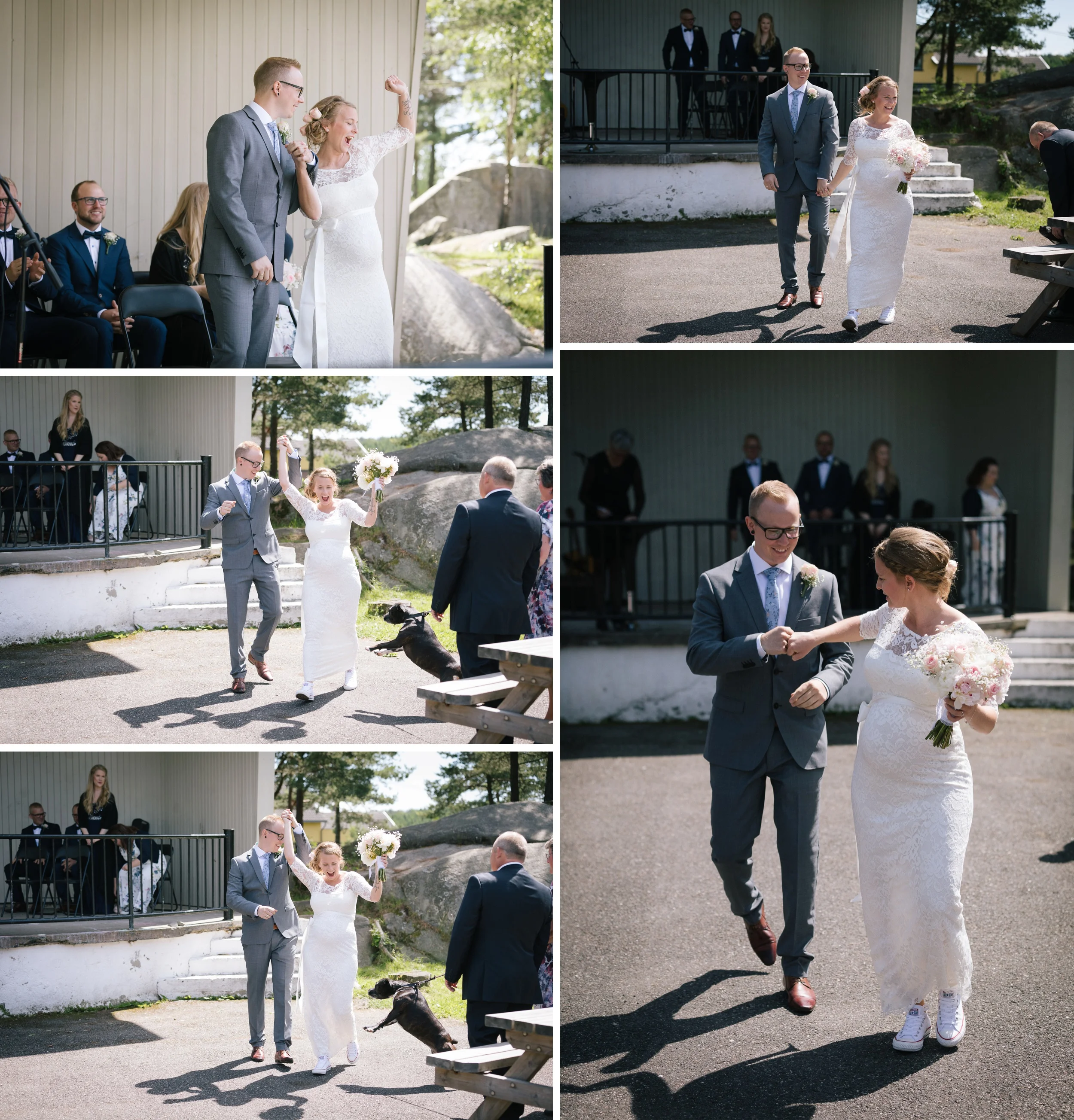 Etter vielsen tok Anneli og Phillip med seg hundene og forloverne sine til Eidet Lensemuseeum/Tømmertunnelen hvor vi tok bryllupsbildene. Her er det en veldig fin variasjon i mellom natur, eldre bebyggelse, broer og vann. Ett fantastisk sted for en bryllupsfotografering.