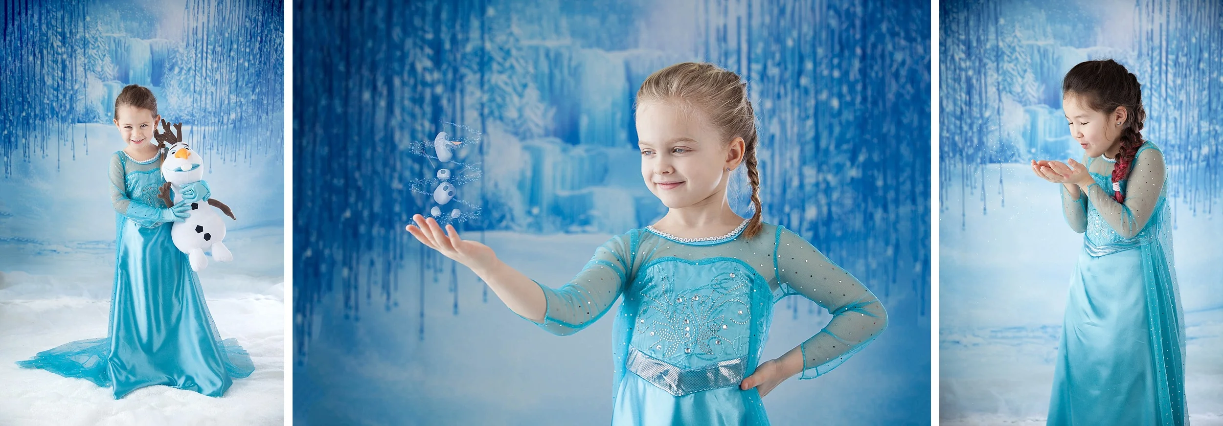 Ønsker du en minneverdig og morsom dag for din prinsesse? Mitt studio er forvandlet til et Frost-vinterland med snø, glitter og store isfjell. Jeg tilbyr Frost-inspirert fotografering for din prinsesse i en nydelig Elsa-kjole. Vi skal trylle fram snø og hilse på Olaf! Dette er en dag din prinsesse sent vil glemme.