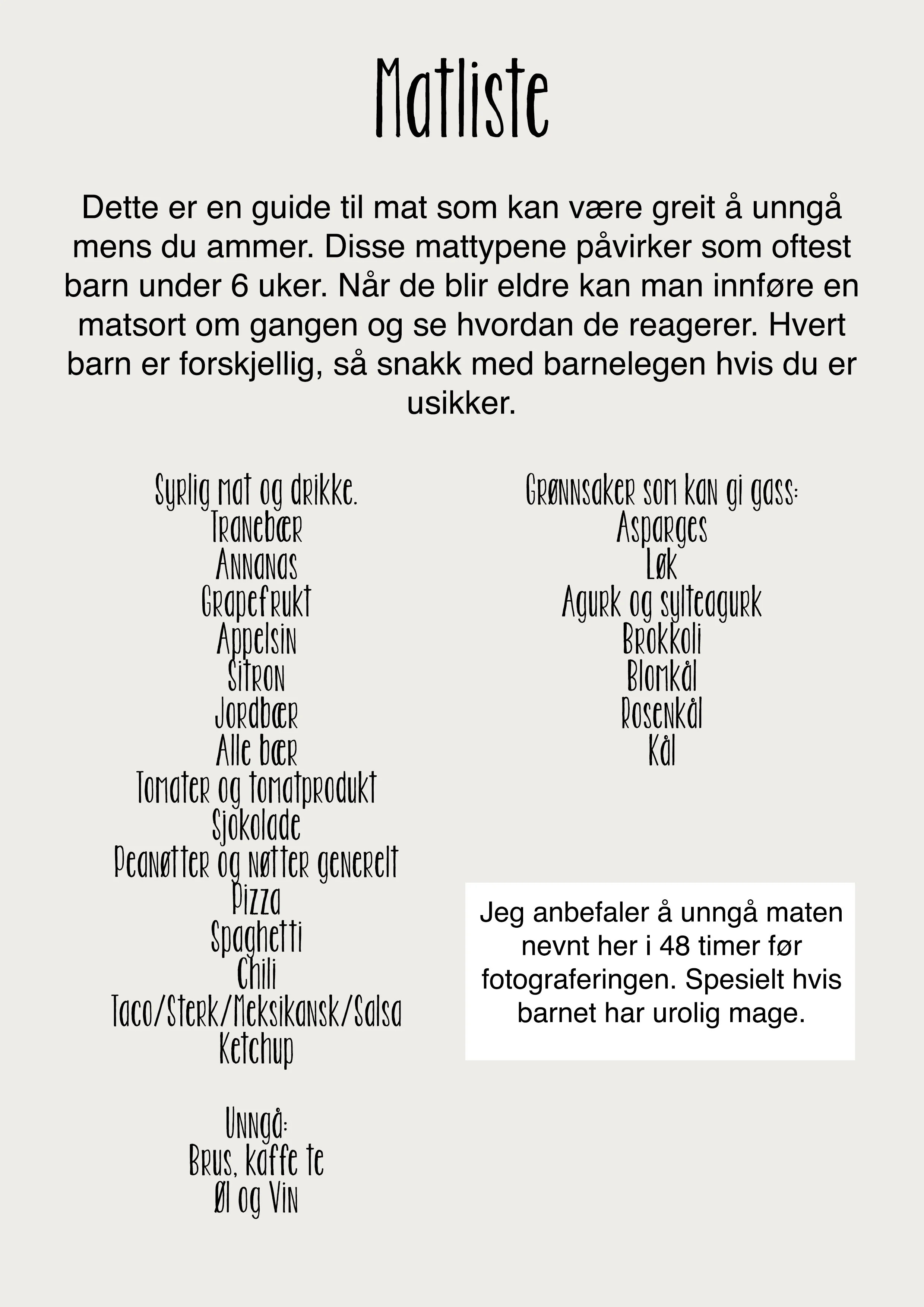 Hvis det er mulig, prøv å holde barnet våkent i tiden før fotograferingen og i bilen på vei til fotograferingen. Da øker man sjansen for at barnet sover under fotograferingen og det er når barnet sover vi får tatt så gode bilder som mulig.