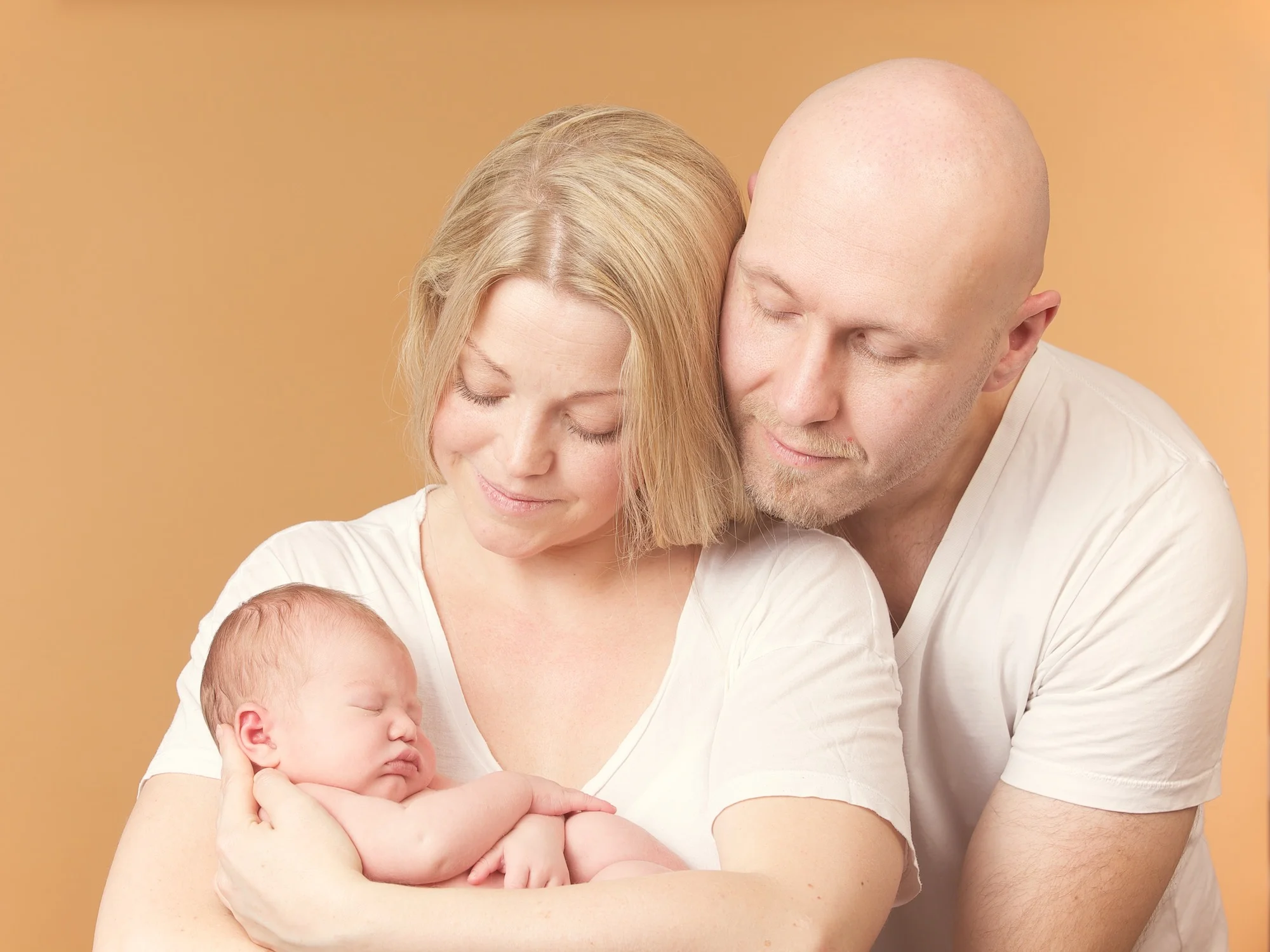 Familiebilder sammen med den nyfødte er noe jeg anbefaler. Erfaringsvis setter man utrolig pris på dette bildet i ettertid. Selvom man kanskje ikke føler seg helt på topp etter å ha født et barn er det kjærligheten til det nyfødte barnet som står i fokus. Til familiebildene bruker jeg sort eller brun/beige bakgrunn. Tenk igjennom hvilken farge du ønsker på bakgrunnen før fotograferingen og gi meg beskjed om hva du ønsker. Valg av bakgrunn bestemmer også hvilke klær dere bør ta med. Sorte til sort bakgrunn og hvit til brun. (t-skjorte/genser uten mønster/trykk) far,mor, evt søsken. Ta gjerne med et ekstra skift.